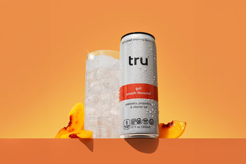 Naturally flavored with notes of peach, Tru Gut Sparkling Drink is a caffeine free functional beverage made with prebiotics, probiotics, and real fruit juice.